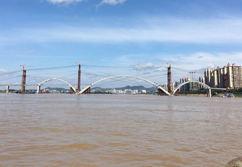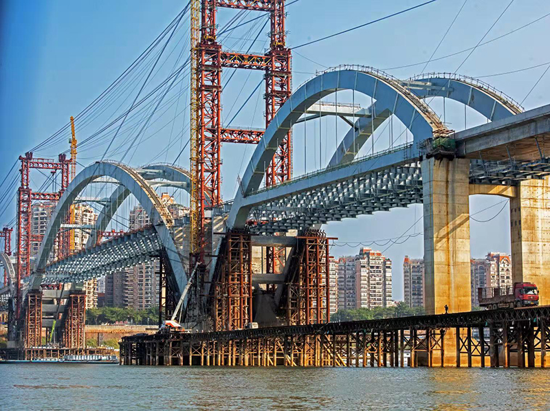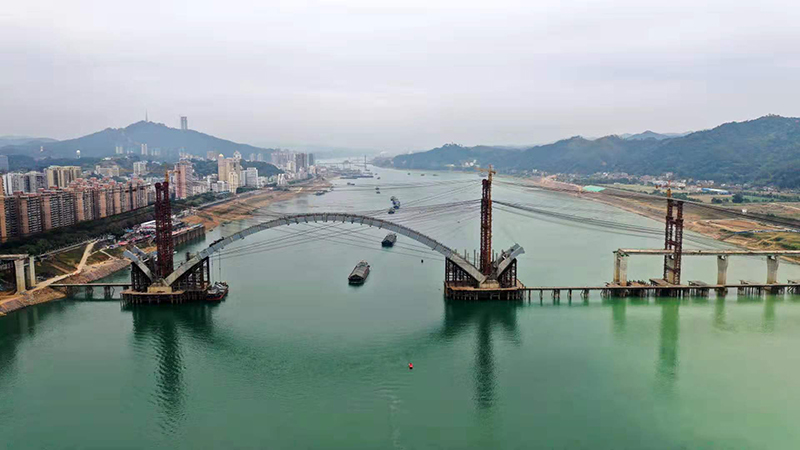 廣西梧州西江四橋為連接梧州河西區(qū)與南岸高旺片區(qū)的中承式雙層連續(xù)鋼箱主梁拱橋,全長1900米,跨徑129+300+129米,采用多塔連跨技術(shù)進行安裝,主拱于2019年12月26日合攏。