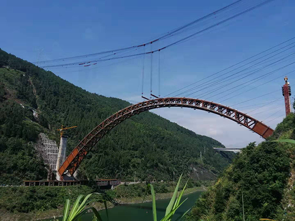 該橋?yàn)榉菍?duì)稱上承式鋼管混凝土拱橋,主跨292米,在同類型橋梁中居世界第一,采用跨度865米的2×150噸纜索起重機(jī),在國內(nèi)首次實(shí)施兩片拱肋同時(shí)整節(jié)段吊裝,主拱于2019年7月31日合攏。