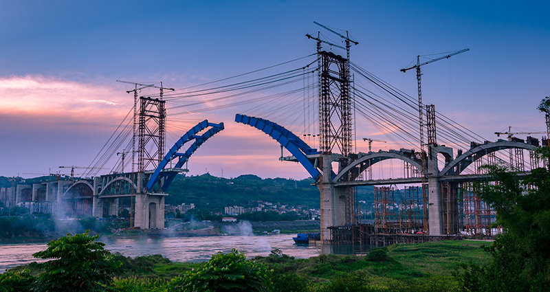 該橋?yàn)閲鴥?nèi)跨徑大的中承式公鐵兩用鋼箱拱橋,主跨336米,采用400噸纜索起重機(jī)吊裝施工,主拱于2017年6月合龍,合龍精度4毫米。