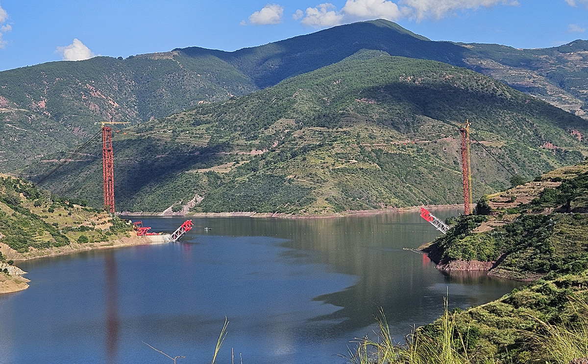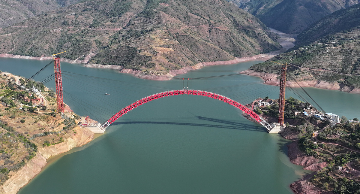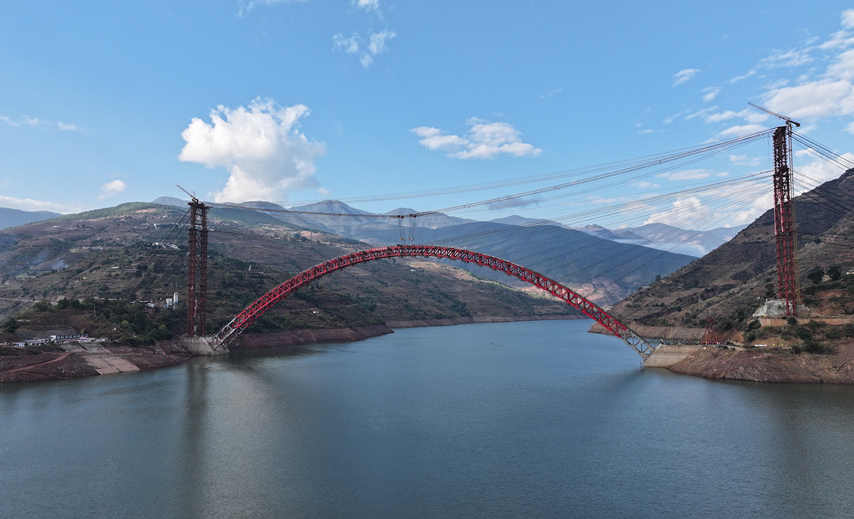 該橋?yàn)橹骺?90米的中承式鋼桁架提籃拱橋,全長(zhǎng)546米,采用160t纜索起重機(jī)進(jìn)行安裝,2025年1月3日合龍。
