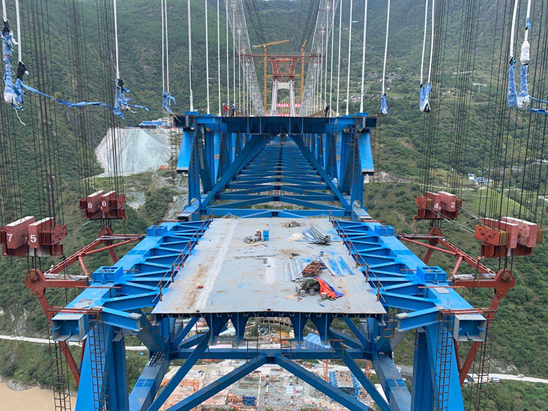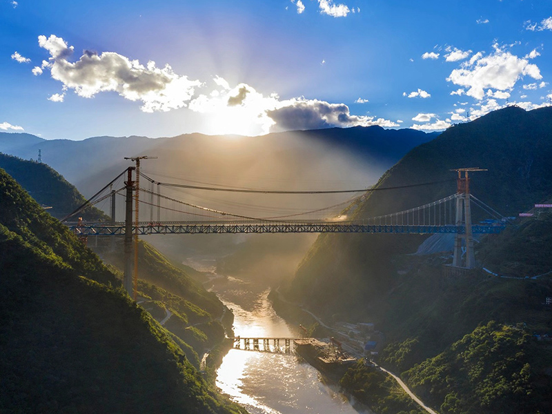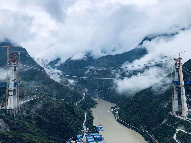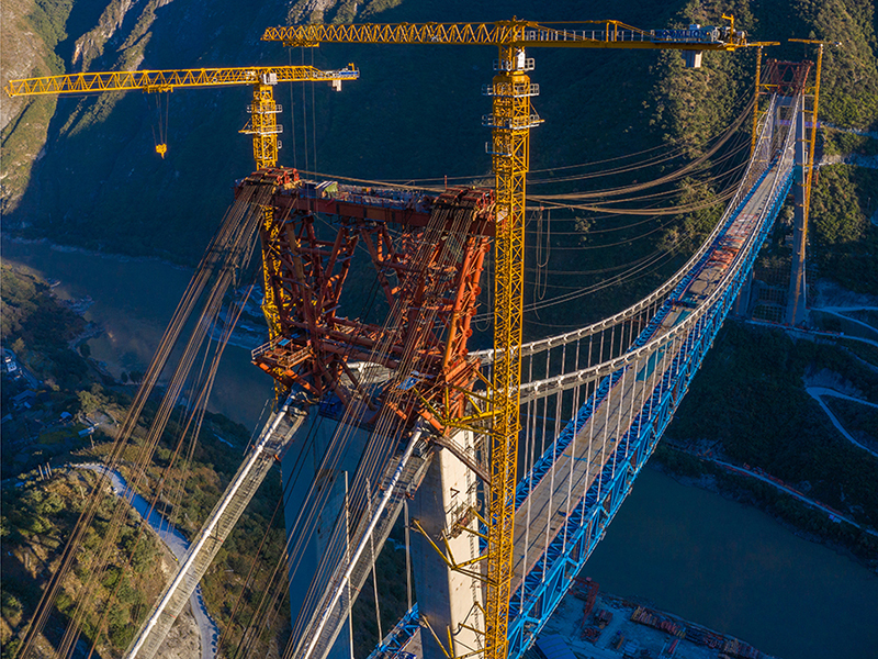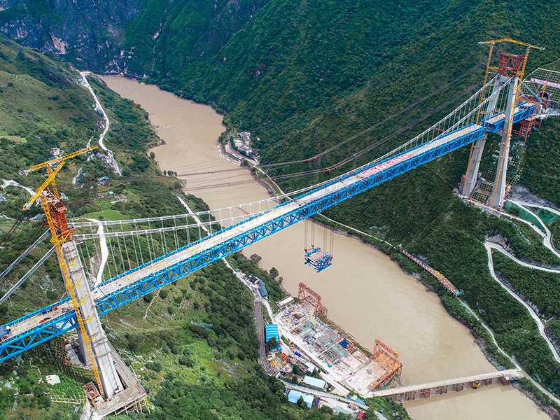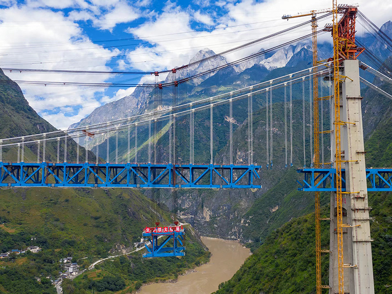 麗香鐵路是連接麗江與香格里拉的“天路”,金沙江特大橋是全線控制性工程。大橋全長(zhǎng)882.5米,主跨達(dá)660米,橋面離江面垂直距離約250米。全橋由71個(gè)節(jié)間鋼桁梁拼裝組成,單片最大鋼桁梁重量達(dá)640噸,采用最大吊重800噸的纜索起重機(jī)進(jìn)行起重吊裝。該橋于2020年11月13日順利合龍。