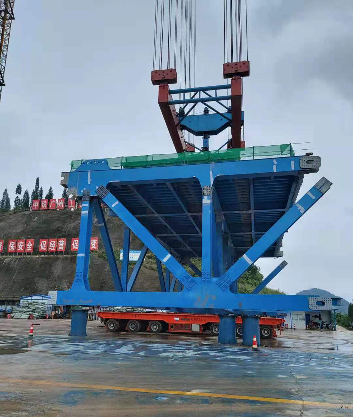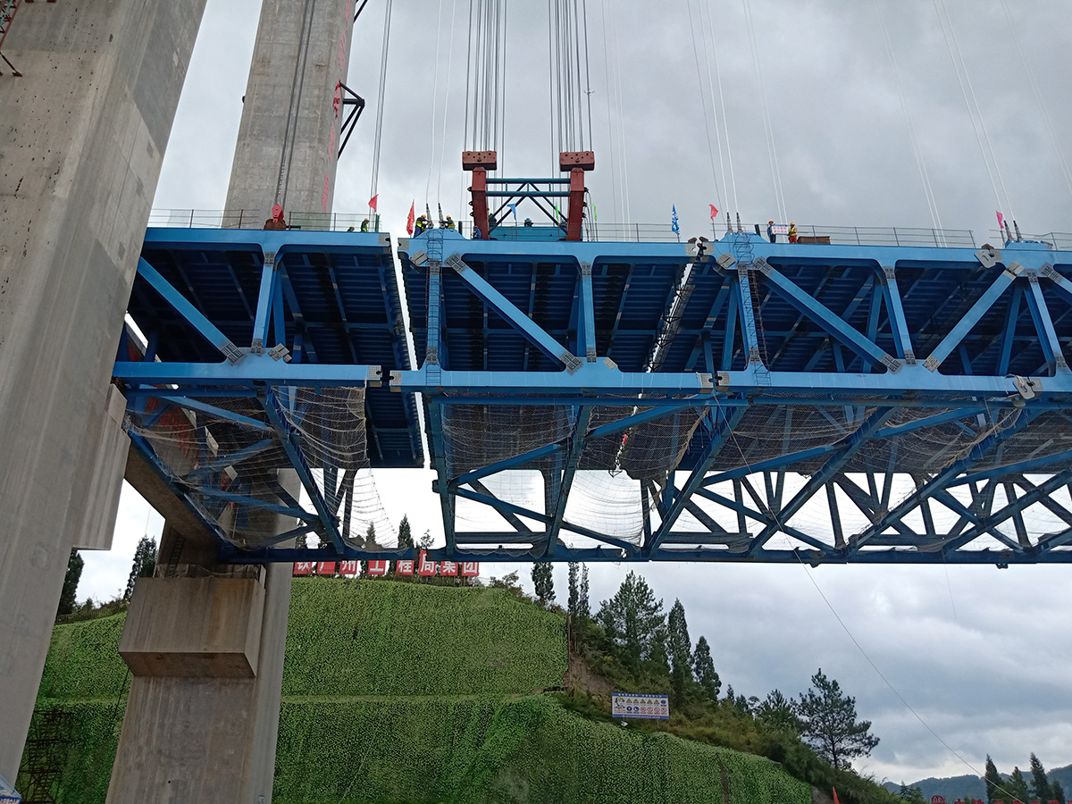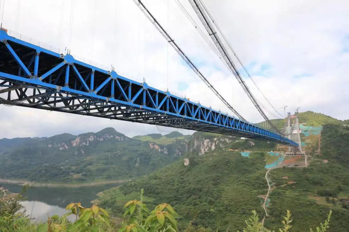 甕開高速開州湖特大橋,為主跨1100米的雙塔單跨鋼桁梁懸索橋,全長1257米,主塔高139米。采用2×125噸纜索吊進行安裝,于2021年8月17日合龍。
