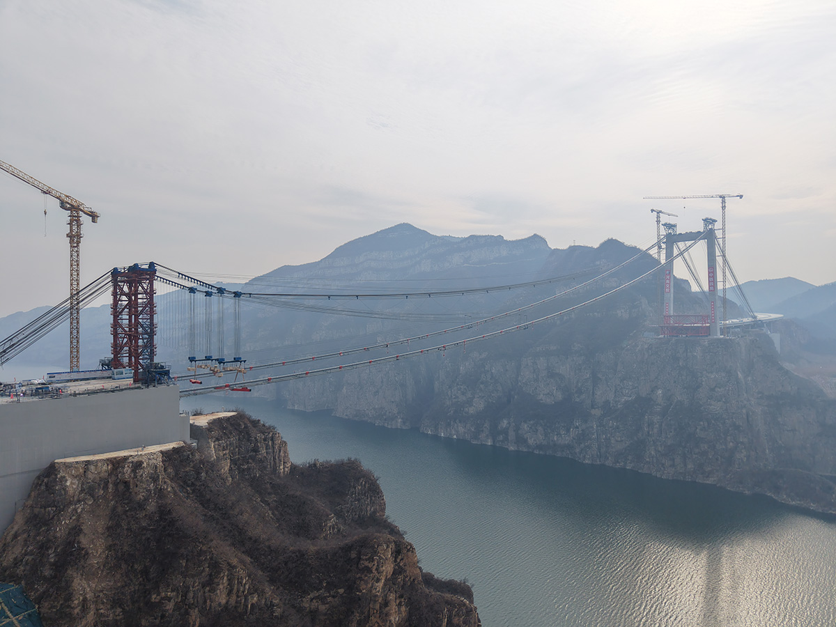 該橋為主跨555米的獨塔單跨地錨式回轉(zhuǎn)纜懸索橋,全長1688.5米,采用2×145t纜索式起重機(jī)進(jìn)行安裝,2025年6月10日合龍。